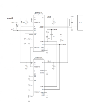 使用菊花链方法可使堆叠功能正常运行。主器件控制一个补偿网络、一个 POWERGOOD 引脚、一个 ENABLE 引脚和一个 I2C 接口。为实现最佳电流共享,必须将堆叠中的所有器件编程为使用相同的电流额定值、开关频率和电流电平。