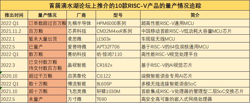 此外,戴伟民博士还回顾了首届滴水湖中国RISC-V产业论坛上推介的10款产品,并展示了这10款产品持续跟踪的结果。他强调:“我们推介的种类很多,但是产品一定要有量产。去年推介的总体量产效果良好,产个别因行业特征尚未量产。”