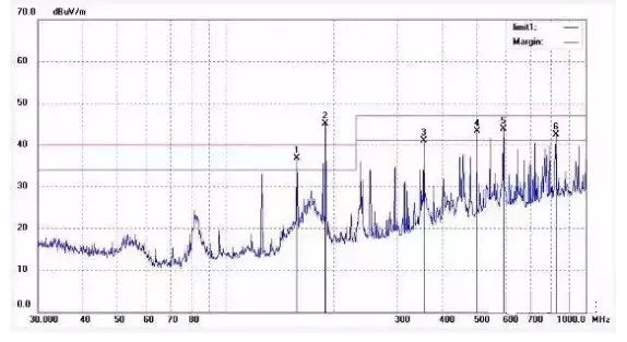 ( 3 ) 在USB 线和电源线都加磁环,测试结果:改善较明显,干扰频点整体有所下降。