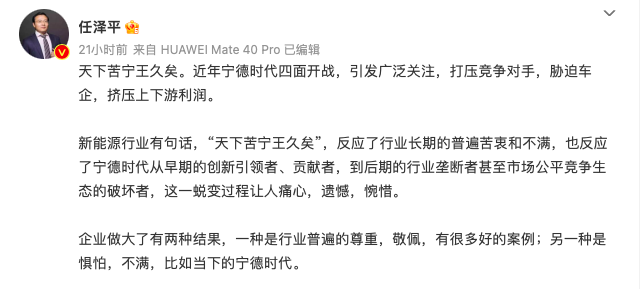 经济学家任泽平,公开炮轰宁德时代,并大吐“天下苦宁王久矣”的苦水。而就如今的行业现状而言,宁德时代的口碑,也并没有其表面那般光鲜亮丽——