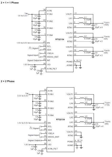 RTQ2134-QA 是通过了 AEC-Q100 Grade 1 认证的电源管理器件,它的内部包含有 4 路可以合并输出或单独输出的同步 Buck 转换器,其中的每一路都具有 5.5A 的电流输出能力,只需在其内部包含的一次性可写入存储器里写入特定的数据即可将其配置为 2+2 或 2+1+1 的形式,可分别提供 10A+10A 或 10A+5A+5A 的两组或三组输出,而每组输出的电压都可通过 I2C 接口进行动态调节以满足负载各种运行模式的需求。