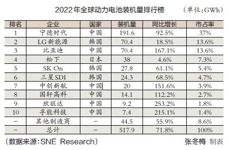 在2022年全球动力电池装机量十强榜单中,中国企业占6席,韩国企业占3席,日本企业占1席。从市占率来看,2021年装机量十强榜单中,中日韩电池厂商所占市场份额分别为48.2%、12%和30.2%;2022年的十强榜单中,中国电池厂商的市场份额增至60.4%,日、韩电池厂商分别降至7.3%和23.7%。如果再加上其他不在十强榜单之内的中国电池厂商,2022年中国动力电池企业的装机量已占到全球的2/3,占比近七成。另外,十强之外厂商的市场份额从2021年的9.5%下滑至8.6%,行业呈现“强者恒强、弱者愈弱”的趋势。