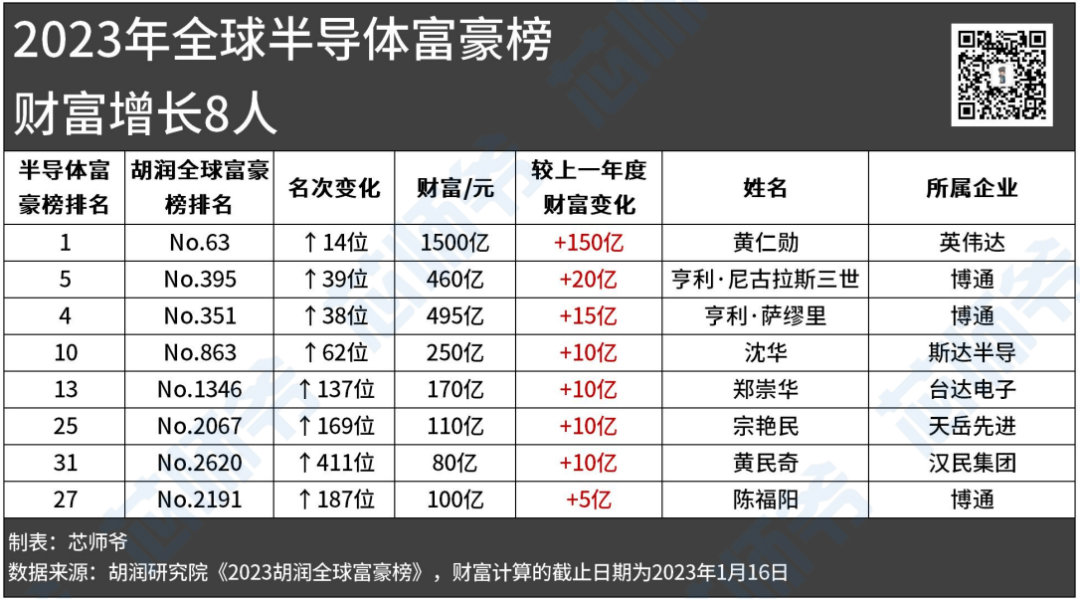 2023年度,半导体产业的新上榜富豪共有5人,但排名却呈现两极化趋势。