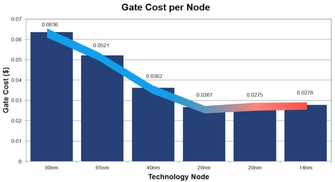 但到了2009年,业内上下开始攻克28nm制程,工程师们才意识到了问题的严重性:晶体管单位制造成本不降反升,制程升级提升性能的性价比开始降低。