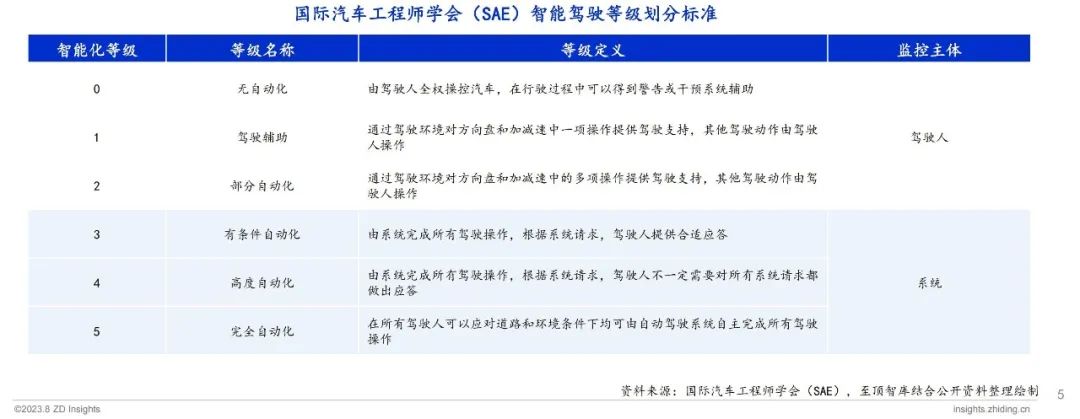 国际汽车工程师学会(SAE)制定J3016智能驾驶分级标准,将智能驾驶技术分为L0-L5共六个等级。L1-L5级分别为驾驶辅助、部分自动化、有条件自动化、高度自动化、完全自动化。SAE对分级的说明更加详细、描述更为严谨,且更好地预见智能驾驶汽车的发展趋势,因而SAE分级成为全球多数国家和政府使用的标准,全球诸多汽车行业相关的企业也采用SAE J3016对自身相关的产品进行技术定义。