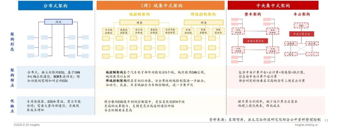 汽车电子电气架构有序迭代,域集中式架构是当前阶段发展的重点,中央集中式架构是未来发展方向。现阶段分布式架构已接近瓶颈,算力、传输速率均无法满足当前智能汽车的需求,(跨)域集中式架构应运而生。未来,集中化汽车E/E架构在汽车电子化浪潮之下已是大势所趋,中央计算平台成为整车的最高决策模块,统一对采集数据进行处理并指挥执行模块进行操作,从传统分布式处理逐步走向集中化、云化。