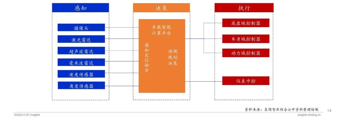 智能驾驶汽车围绕“感知、决策和执行”三大环节构建软硬件系统。感知环节:利用摄像头、激光雷达、毫米波雷达等传感器获取道路环境的信息,并对传感器数据进行处理,实现对车辆、行人等障碍物的识别以及对车道线、红绿灯等交通标识的检测;决策环节:车载智能计算平台是智能驾驶汽车的“大脑”,主要负责感知环节的识别融合任务,并处理海量数据和进行复杂的逻辑运算;执行环节:各类控制器接收决策系统输出的目标路径轨迹,通过一系列结合自身属性和外界物理因素的动力学计算,转换成对油门、刹车、转向的控制。