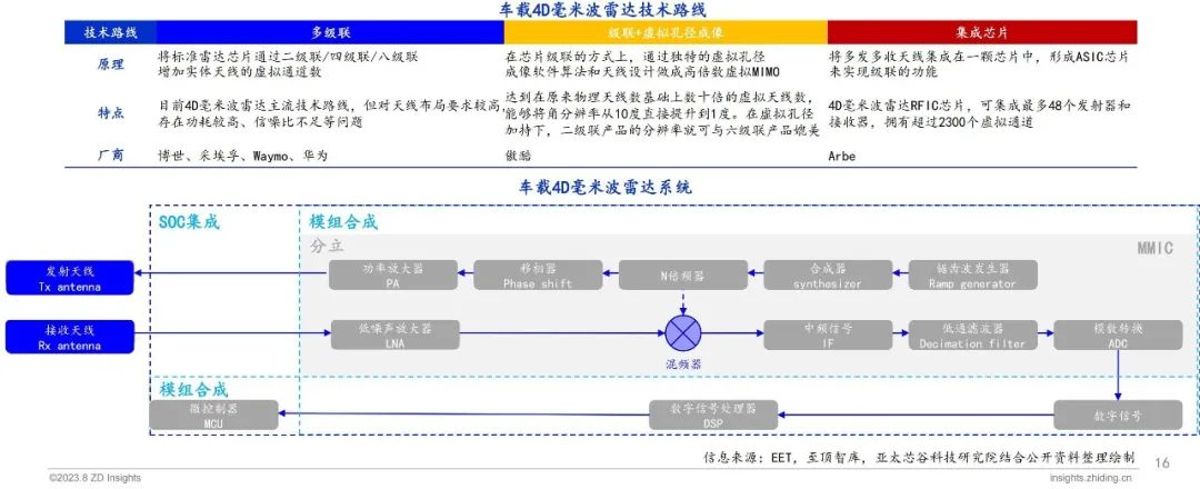 车载4D毫米波雷达具备高度探测、更高目标点云密度、更远探测距离、穿透性强等优势,正成为车载毫米波雷达的重点发展方向。4D毫米波雷达的技术路线主要分为三种,分别是多级联、级联+虚拟孔径成像技术以及集成芯片。