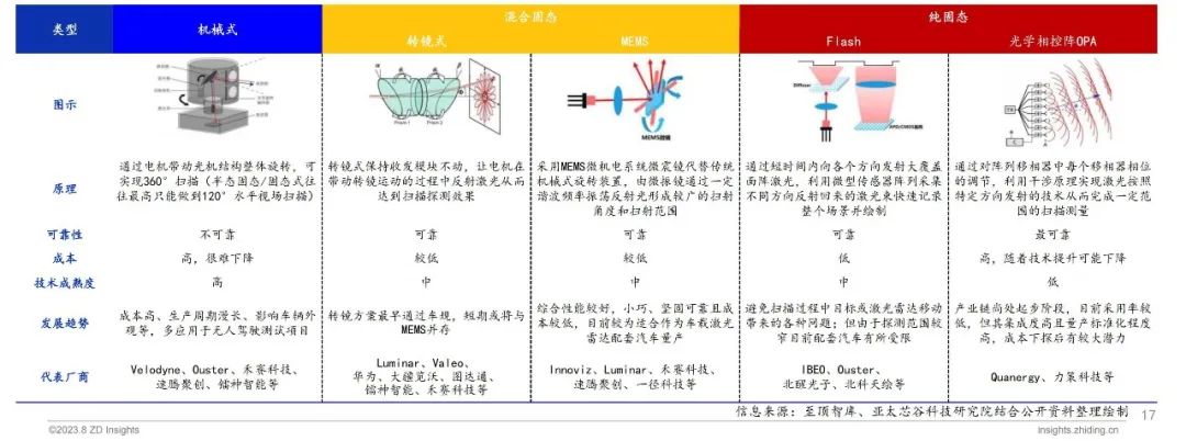 车载激光雷达是通过发射激光束、接收回波信号探测目标位置、反射强度等数据的雷达系统。其具备分辨率高、探测范围广、信息量丰富等优势,主要由发射系统、接收系统、信息处理系统和扫描系统组成。按照扫描方式可划分为机械式、混合固态、纯固态三种类型;混合固态分为转镜式和MEMS,纯固态分为光学相控阵OPA和Flash。转镜式和MEMS方案作为当前激光雷达市场的主流,光学相控阵OPA未来有望在车载领域实现商用。