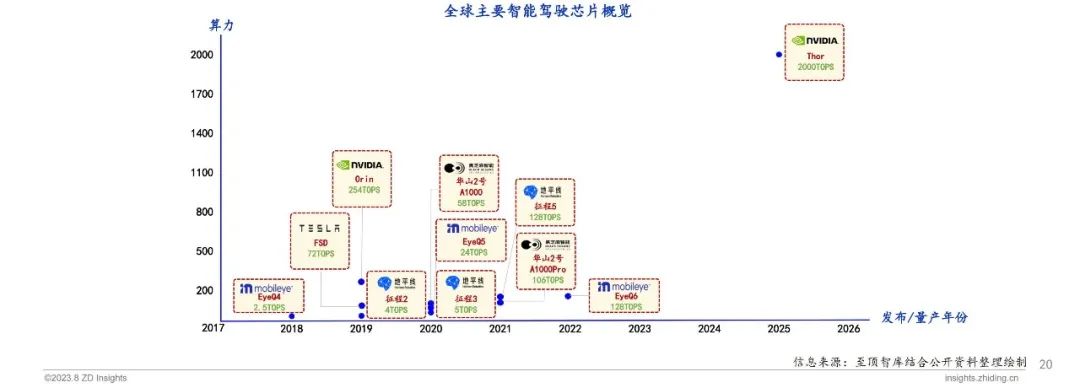 近年来,全球主要芯片厂商相继推出适用于不同等级的智能驾驶芯片,持续推动智能驾驶的发展。具体来看,Mobileye智能驾驶芯片EyeQ4、EyeQ5、EyeQ6适用于L2-L4驾驶等级;NVIDIA推出的Orin芯片广泛应用在蔚来、理想、小鹏等主流品牌的相关车型中。Thor属于NVIDIA推出的高性能芯片,芯片算力高达2000TOPS,计划于2025年开始量产。地平线于2019-2021年相继发布征程2、征程3及征程5芯片,征程系列芯片累计出货量已经突破350万片,已与超过20家国内与国际主流车企签下超过150款车型前装量产项目定点,已有50多款量产车型。