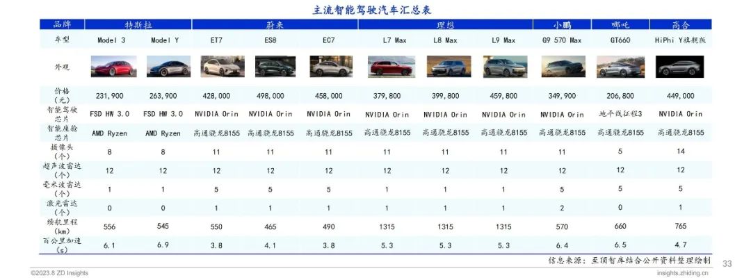 目前主流智能驾驶汽车的智能驾驶芯片多采用英伟达Orin芯片,相关车型也有采用地平线征程芯片;从智能座舱芯片来看,多数车型采用高通骁龙8155芯片;从传感器来看,摄像头、超声波雷达、毫米波雷达、激光雷达成为主流车型的标配,传感器整体数量达到20个以上。