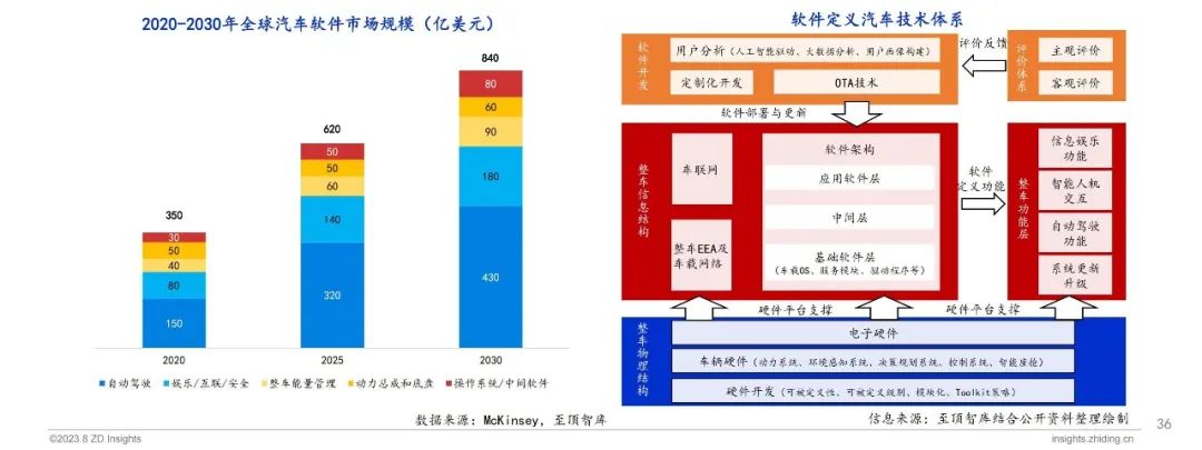 软件定义汽车(software defined vehicles,SDV)具体是指在模块化和通用化硬件平台支撑下,以人工智能为核心的软件技术决定整车功能的未来汽车。软件定义汽车功能的增加与升级可通过软件的远程部署与更新来实现,汽车硬件将成为模块化、通用化的平台和资源池,支撑整车软件多样化开发与部署。从市场规模来看,全球汽车软件市场规模将从2020年的350亿美元增长到2030年的840亿美元,未来市场前景广阔。