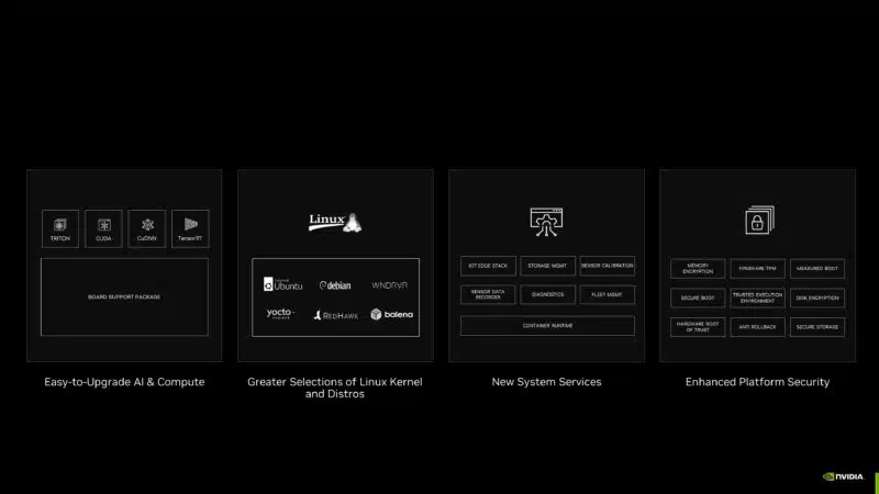 全新 NVIDIA JetPack 6 将于今年年底推出,AI 开发者将无需全面升级 Jetson Linux 就能保持在计算领域的最前沿,从而大幅加快开发进度,不再依赖 Jetson Linux。JetPack 6 还将通过与 Linux 发行版合作伙伴的合作,扩大基于 Linux 的发行版的选择范围,包括 Canonical 的优化及经过验证的 Ubuntu、Wind River Linux、并行实时 Redhawk Linux 以及各种基于 Yocto 的发行版。