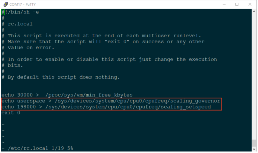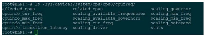 root@ELF1:~# echo userspace > /sys/devices/system/cpu/cpu0/cpufreq/scaling_governorroot@ELF1:~# echo 198000 > /sys/devices/system/cpu/cpu0/cpufreq/scaling_setspeed
