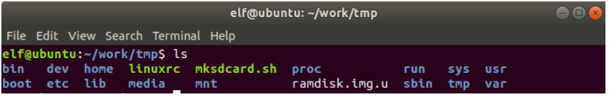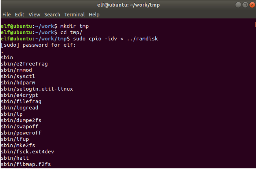elf@ubuntu:~/work$ mkdir tmpelf@ubuntu:~/work$ cd tmp/elf@ubuntu:~/work/tmp$ sudo cpio -idv < ../ramdisk