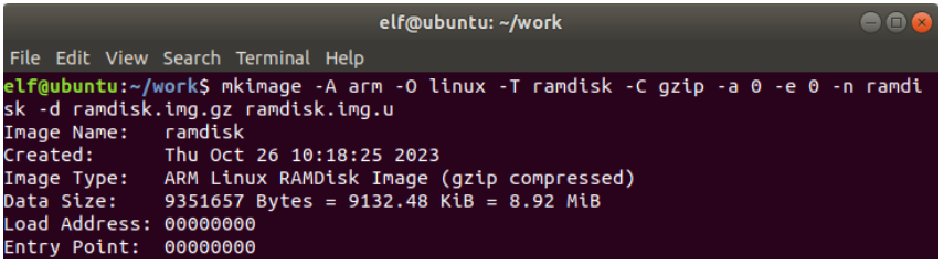 elf@ubuntu:~/work$ mkimage -A arm -O linux -T ramdisk -C gzip -a 0 -e 0 -n ramdisk -d ramdisk.img.gz ramdisk.img.u