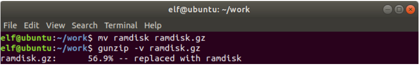 elf@ubuntu:~/work$ mv ramdisk ramdisk.gzelf@ubuntu:~/work$ gunzip -v ramdisk.gz
