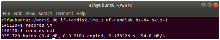 elf@ubuntu:~/work$ dd if=ramdisk.img.u of=ramdisk bs=64 skip=1