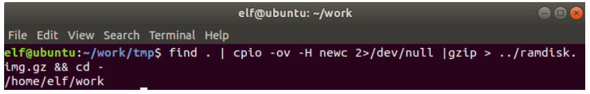 elf@ubuntu:~/work/tmp$ find . | cpio -ov -H newc 2>/dev/null |gzip > ../ramdisk.i