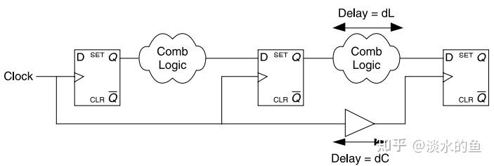 如果通过逻辑延迟(dL)小于时钟线延迟(dC) ,则可能发生第二个触发器传播的信号将在时钟采样之前到达第三级的情况。当时钟采样沿到达时,数据可能已经丢失,这种情况将导致电路的灾难性故障,因此在进行时序分析时必须考虑时钟偏差。同样重要的是要注意,时钟倾斜与时钟速度无关。