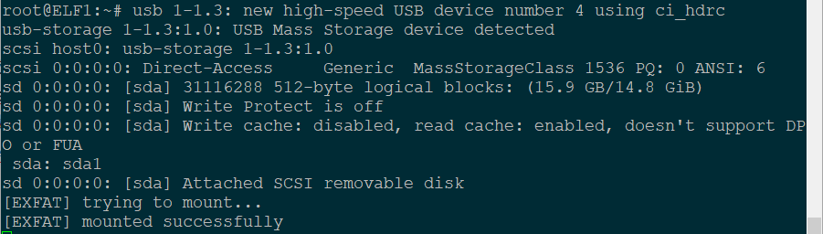 8、等待重启完成,U盘格式化为exFAT格式,插到ELF 1开发板上,可自动挂载