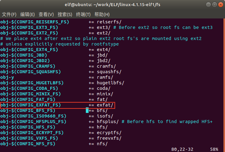3、修改fs/Makefile文件,在obj-$(CONFIG_FAT_FS) += fat/下添加obj-$(CONFIG_EXFAT_FS) += exfat/