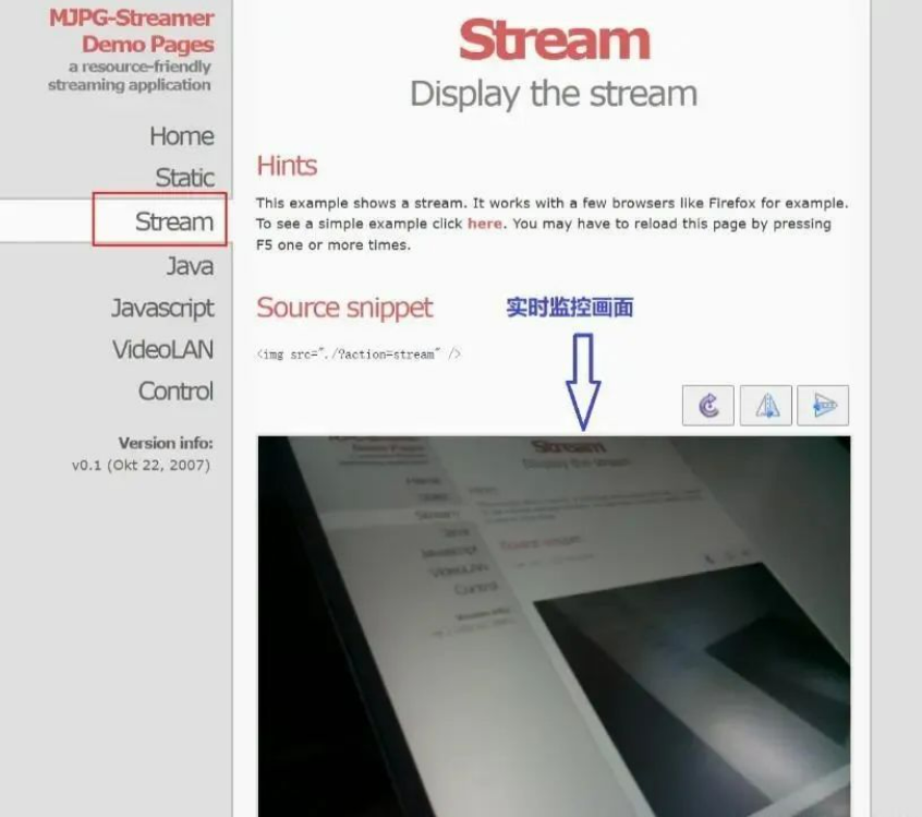 当开发板运行mjpg_streamer成功后,在浏览器中输入开发板的IP地址和8080端口号,比如我的是192.168.0.106:8080,点击Stream选项就会出现摄像头中的实时画面,如下图所示。
