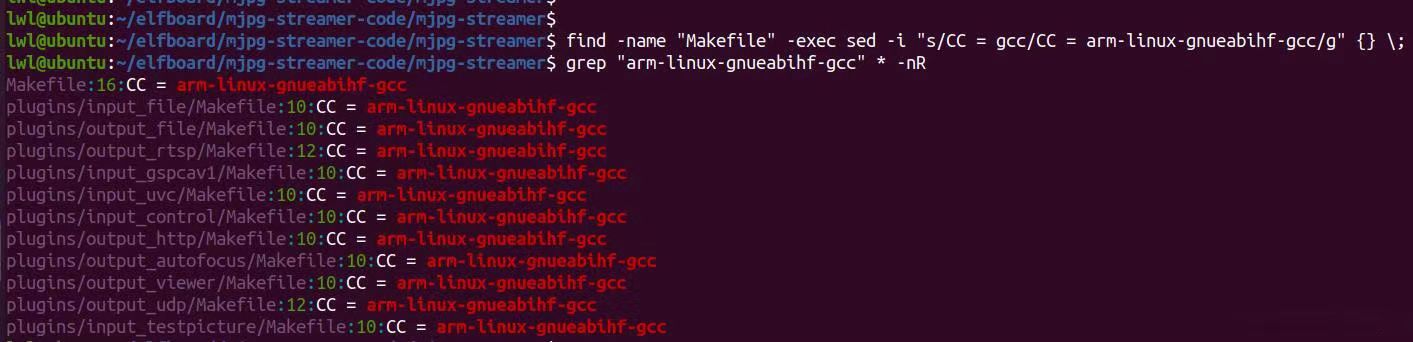 搜索当前目录及其子目录下的所有Makefile文件,并将Makefile里的CC变量设置为arm-linux-gnueabihf-gcc。(注:arm-linux-gnueabihf-gcc 需要换成自己的交叉编译工具。)