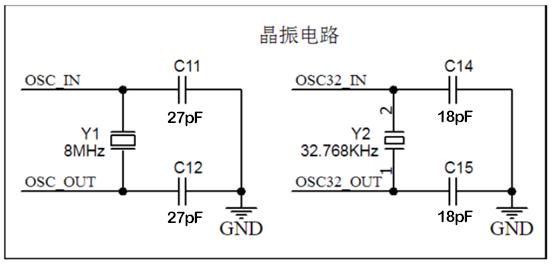 如下图所示,晶诺威科技建议:从理论中讲,当8MHz无源晶振负载电容CL=18pF,外接的起振电容C11=C12=27pF;当32.768KHz无源晶振负载电容CL=12.5pF时,外接起振电容C14=C15=18pF。因为电路板杂散电容存在差异,建议实测晶振实际输出频率后选择最佳匹配电容。