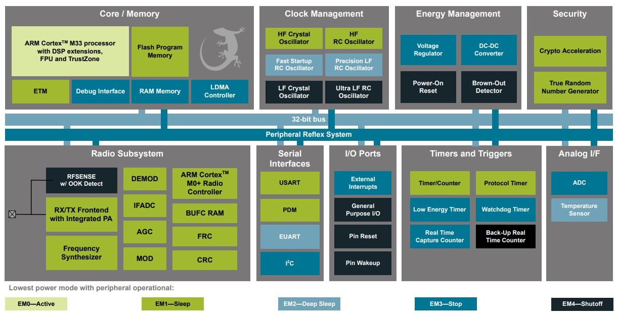 - 1.75μA EM2深度睡眠电流(保留32kB RAM,RTC从PrecisionLFRCO中运行)