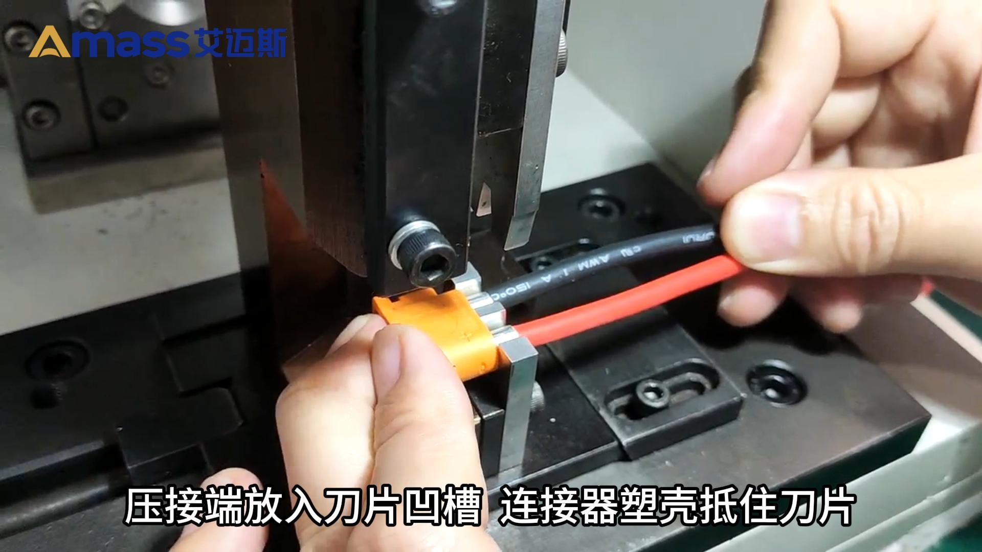 以XLB40连接器为例,将黑色剥线端塞入连接器的负极铆线孔,红色剥线端塞入连接器的正极铆线孔;之后将连接器压接端放入刀片凹槽,连接器塑壳抵住刀片,踩下脚踏板;压接动作完成后,抽离线束。