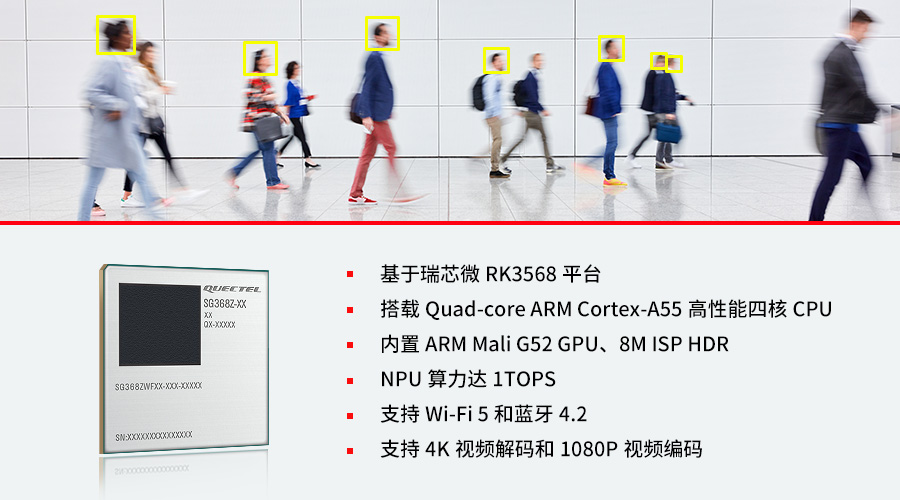 SG368Z系列基于瑞芯微RK3568平台,搭载ARM 高性能四核Cortex-A55 CPU和ARM Mali G52 GPU,主频高达2 GHz,NPU算力达1 TOPS,可运行丰富的深度学习算法,为人脸识别、车牌识别、驾驶员安全带识别、人流统计、安全帽检测、电瓶车检测、危险区域示警等提供完整场景应用和算法。目前,该系列模组已在多个生活场景中大量运用。
