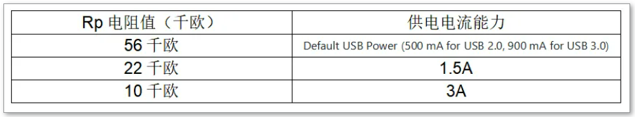 当设备(UFP)连接到主机(DFP)时,它会通过CC1或CC2引脚检测到相应的电压,这个电压由DFP的上拉电阻(Rp)决定,并根据表中的电阻值来判断主机的供电能力。