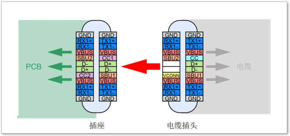 2、电缆插入:如果插入方向使得CC1引脚接触到DFP的上拉电阻(Rp),则CC1会被上拉,UFP检测到相应的电压,表示正向连接。如果插入方向使得CC2引脚接触到DFP的上拉电阻(Rp),则CC2会被上拉,UFP检测到相应的电压,表示反向连接。