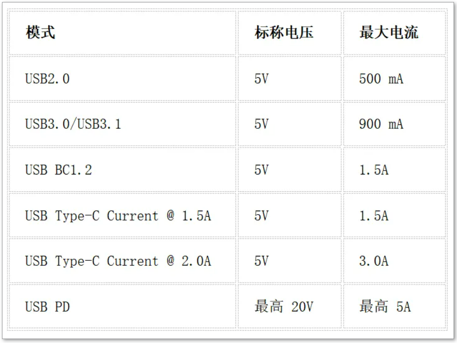 拉电流电源 / 供电设备:5V-20V 时的拉电流最多为 5A,典型示例为传统的标准 Type-A 端口。