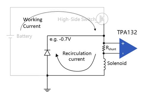 TPA132Q的宽共模电压范围(-4V至80V)使其能够在各种复杂电压环境下可靠工作,有效避免因电压超出范围而导致的检测失误,可用于高边和低边检测场景。例如,在电磁阀应用中,高边开关从开启到关闭的过程中,由于感性负载(电磁阀线圈)对电流的影响,共模电压可能从正48V变到负0.7V,TPA132Q都能够正常工作。