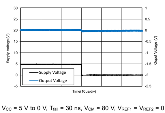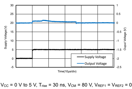 在电机驱动等系统中,电流检测是实现闭环控制的重要环节。一些放大器在上电或者下电过程中,由于内部电路节点是不可控的状态,放大器输出信号可能会出现短脉冲,这些短脉冲可能会对引起后级系统的误动作。TPA132Q通过设计优化,即使在有80V输入共模时,电源上下电过程中输出信号也没有误脉冲。