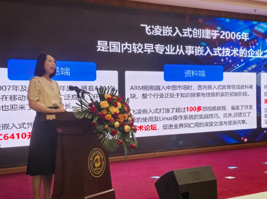 飞凌嵌入式教育事业部总监在研讨会上分享了“嵌入式教育新体验”,她首先回顾了2023年飞凌嵌入式宣布重新回归嵌入式教育市场的重要决策,并为此创立了旗下教育品牌“ElfBoard”,之后详细阐述了“ElfBoard”的品牌愿景,希望将企业的实践经验与高校的理论研究相结合,共同构建一个既注重理论基础又强调实践操作的嵌入式教育生态系统。