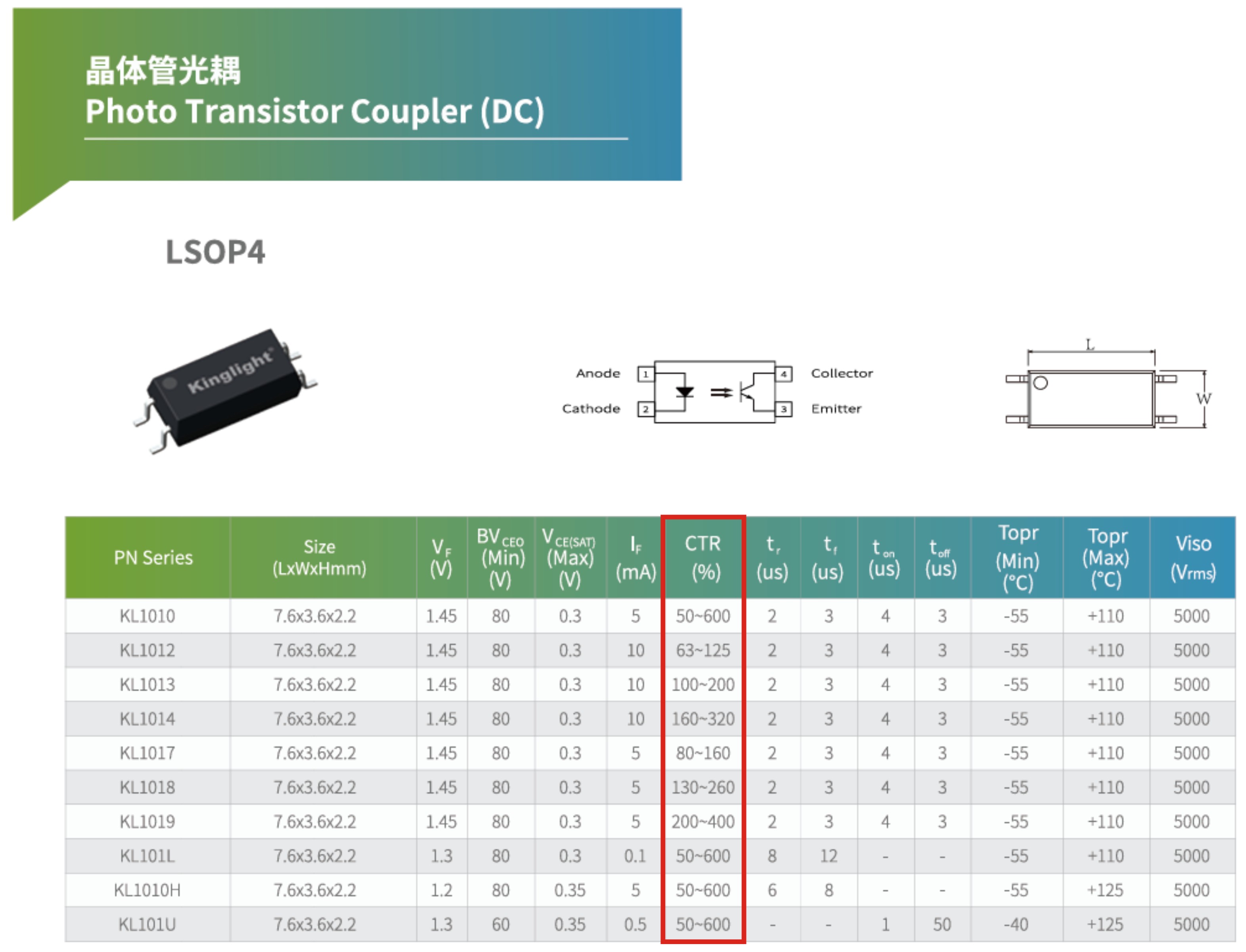LED电流(IF):输入电流IF的大小会直接影响CTR,通常在设计中需要仔细调整LED电流,以确保合适的CTR。