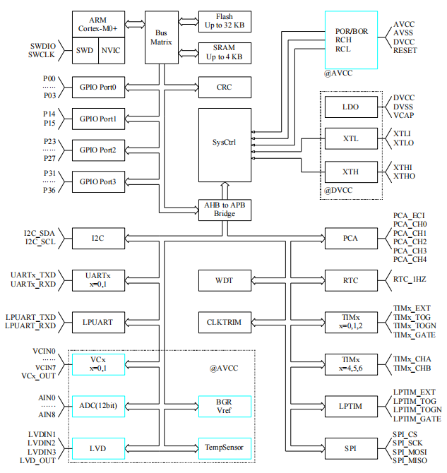 - 集成低电压侦测器LVD,可配置16阶比较电平,可监控端口电压以及电源电压