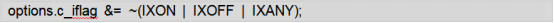 (1)termios_p->c_iflag &= ~(IGNBRK|BRKINT|PARMRK|ISTRIP|INLCR|IGNCR|ICRNL|IXON);