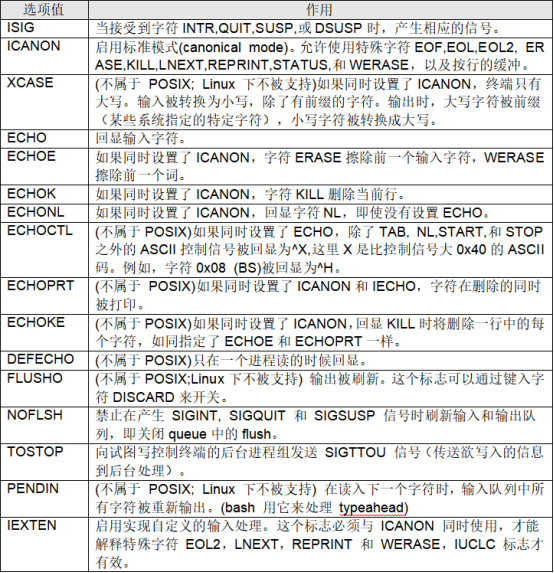c_lflag选项值表: