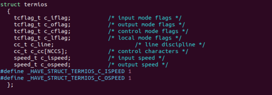 POSIX规范中定义了标准接口-termios结构体,在linux中用termios来设置串口参数,如前面提到的波特率、停止位、校验位、数据位等。它的详细描述在<termios.h>中的<bits/termios.h>。