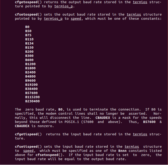 ③cfgetispeed() 返回值为termios 结构中存储的输入波特率;