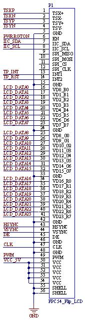 液晶模块采用了电容触摸,对应驱动板的P2接口,通过I2C挂载了一颗GT911的芯片,引脚定义及原理图如下图所示: