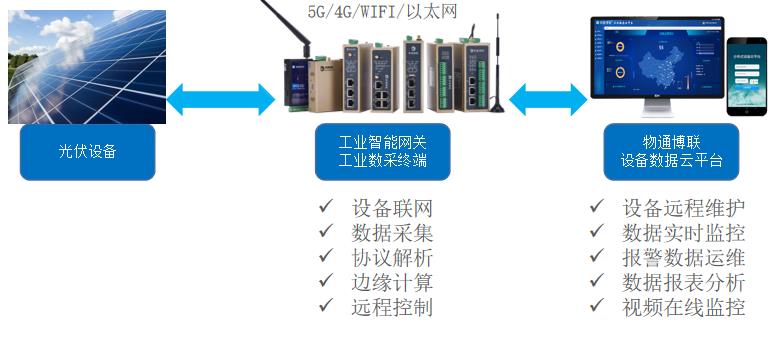 物通博联分布式光伏储能系统远程监控运维解决方案通过工业智能网关实现光伏发电系统和储能系统设备的数据采集,通过5G/4G/WIFI/以太网等上网方式将数据传输到监控云平台,通过云平台实现设备的实时监控、远程管理、故障报警、远程维护等功能,实现对光伏储能系统进行精细化管理,保证光伏发电和储能设备的正常运行,有效提升管理水平和经济效益。