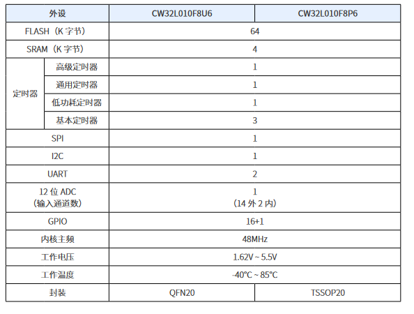 先看板子的芯片,当然就是CW32L010F8P6。这是一款ARM的Cortex-M0+ 48MHz的低功耗芯片,具体如下: