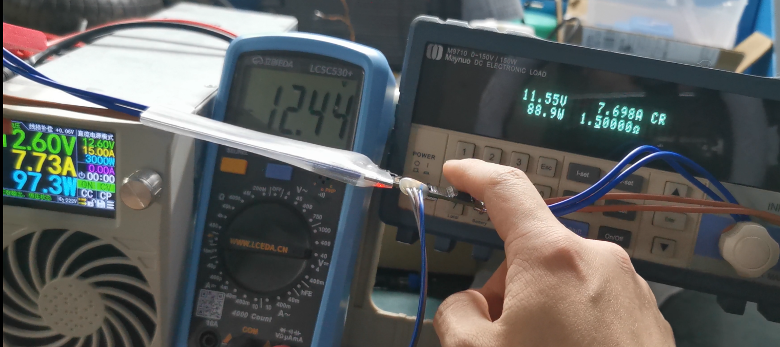 最开始电阻模式的时候,负载电阻值在2Ω左右的时候MOS管发热还不明显。后面在1.5Ω的时候发热比较明显,比较烫手。