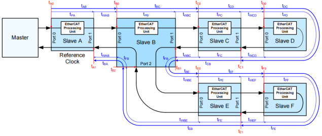 上图展示了一个典型的EtherCAT网络及其各从站之间的网络延迟。在EtherCAT系统中,有些延迟可以基于EtherCAT的标准而默认为相同,例如每个从站处理单元的延迟,我们标记为tPA = tPB = tPC = tPD = tPE = tPF。这一延迟是指从从站接收到数据包开始,到该从站处理完并发出数据包为止的时间。正如之前所提,EtherCAT的通信机制类似于一辆“通信列车”,它在每个从站中的停留时间都是固定的。