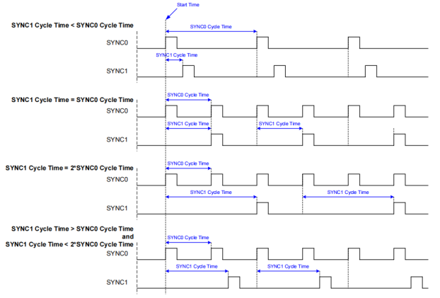 那么,在从站时钟同步后,我们又是如何保证这些从站能够同步工作呢?EtherCAT从站控制器(ESC)为此提供了SyncSignals功能,这些信号能够与EtherCAT系统时间保持同步。SyncSignals不仅可以直接被使用(如作为中断触发),还能用于数字输出的更新和数字输入的采样。